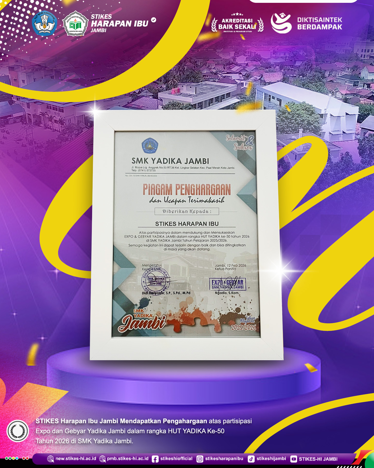 Selamat STIKES Harapan Ibu Jambi Meraih Penghargaan atas partisipasi dan dukungan pada Expo dan Gebyar Yadika Jambi. Dalam rangka HUT YADIKA Ke-50 Tahun 2026 di SMK Yadika Jambi Tahun Pelajaran 2025/2026 sebagai bentuk apresiasi atas kontribusi aktif selama kegiatan berlangsung.